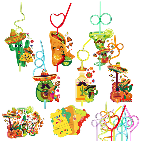 Huancai 24 Packs Cinco De Mayo hediye tebrik kartları meksika Fiesta parti malzemeleri için renkli döngü çok kullanımlı içecek pipetleri ile