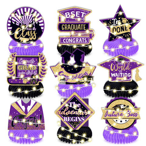 FW047รังผึ้งตกแต่งหน้าโต๊ะสำหรับจบการศึกษาการตกแต่งงานรับปริญญาสำหรับงานเลี้ยงรับปริญญาสีม่วงและสีดำ